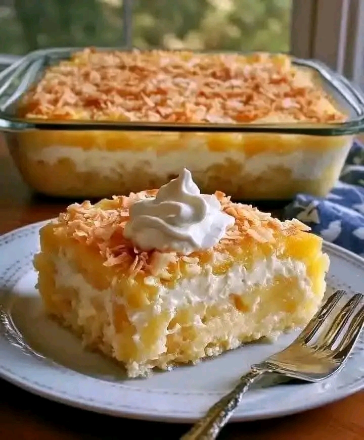 Bake the yellow cake as directed on the package, using a 9×13 inch pan. Let cool completely.In a bowl, combine crushed pineapple (with its juice) and half the coconut.Poke holes in the cooled cake with the back of a wooden spoon. Pour the pineapple and coconut mixture over the cake, letting it soak into the holes.In another bowl, whisk together the pudding mix and milk until smooth. Spread over the cake.Spread whipped topping over the pudding layer. Sprinkle with the remaining shredded coconut.Refrigerate the cake for at least 4 hours, or overnight, before serving.Enjoy the Pineapple Coconut Dream Cake as a refreshing and tropical dessert that’s sure to please.