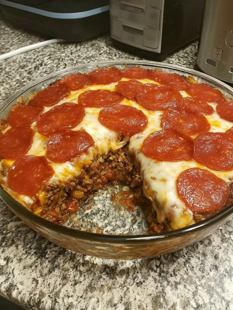 :1. Preheat the OvenSet oven to 375°F (190°C).Grease a round or square baking dish.2. Cook the Meat LayerIn a skillet, brown the ground beef (or sausage) until fully cooked.Drain excess fat.Add marinara sauce, garlic powder, onion powder, Italian seasoning, salt, and pepper.Simmer for 3–5 minutes to thicken slightly.3. Assemble the CasseroleSpread the meat mixture evenly on the bottom of the baking dish.Add small spoonfuls of ricotta or cream cheese on top and gently spread.Sprinkle half of the mozzarella and cheddar over the top.Layer pepperoni slices across the top (like in your image).Sprinkle with Parmesan.4. BakeBake uncovered for 20–25 minutes, until the cheese is bubbly and golden.For extra crisp pepperoni, broil for the last 2–3 minutes.5. ServeLet it cool for 5 minutes before slicing.Enjoy hot — tastes like a deep-dish pizza without the carbs!Nutrition (per serving, 6 servings)Calories: 420Fat: 33gProtein: 28gNet Carbs: 4g