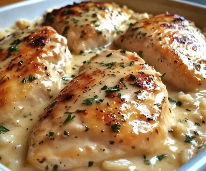 Preheat the oven to 350°F (175°C).In a large greased baking dish, spread the uncooked rice evenly across the bottom.Place the chicken breasts on top of the rice.