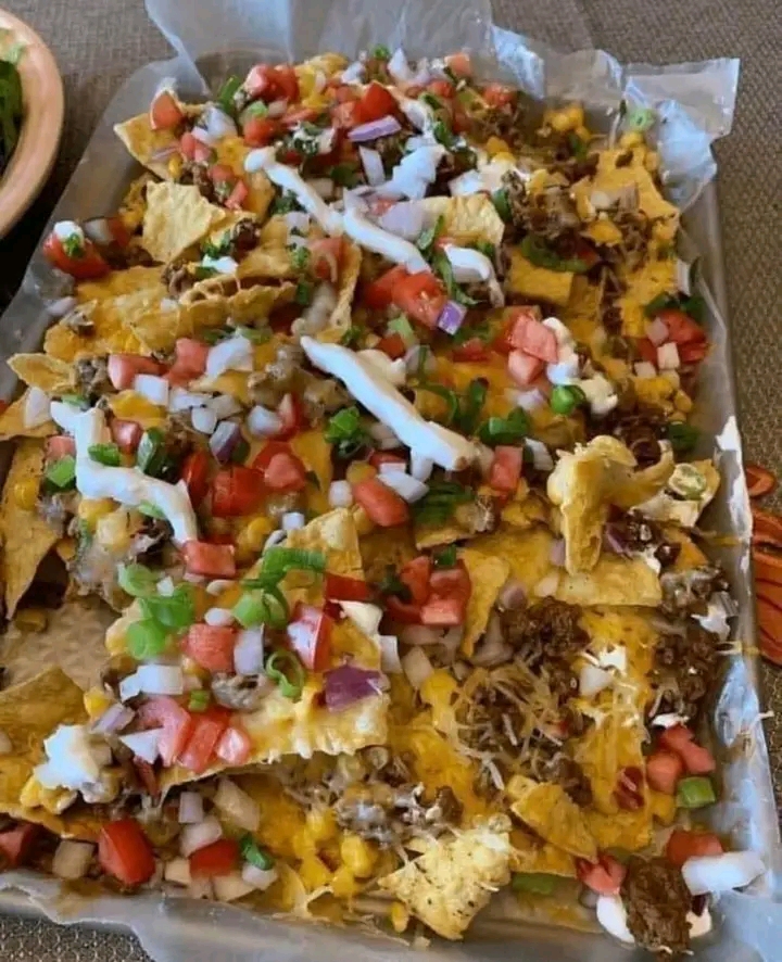 Preheat the oven at 400 degrees.Meanwhile on the stovetop, brown the ground beef and diced onions over medium-high heat until fully cooked (about 8 minutes) and drain.Return the beef to the pan, and sprinkle on the taco seasoning.Stir in 3/4 cup water, bring it to a simmer, reduce heat and simmer until the liquid mostly evaporates, about 5 minutes.While the beef is cooking, add a generous layer of chips to a baking sheet lined with parchment paper.Spoon on refried beans(I add a little water to them and warm them in the microwave first for easier spreading), These are thick, but I just add spoon fulls all over the chips. (The spoon fulls will spread with the heat of the oven.)Sprinkle ground beef over beans and chips.Sprinkle shredded cheese on top.Bake at 400 degrees for 15 minutes.Remove from the oven, and sprinkle on diced tomatoes and green onions. You can add black olives and jalapeños if you wantI always put a little bowl of sour cream, and another with salsa on the table with these. Serve immediately.